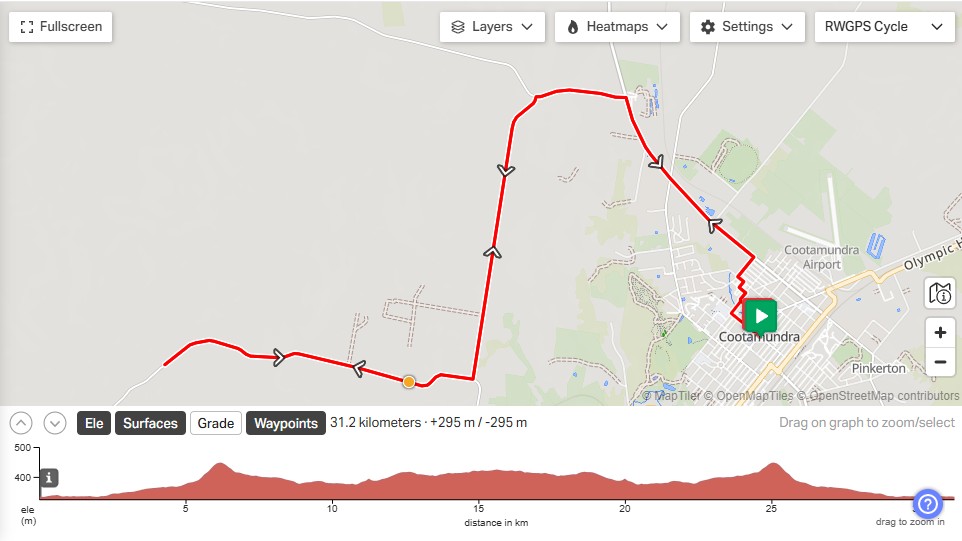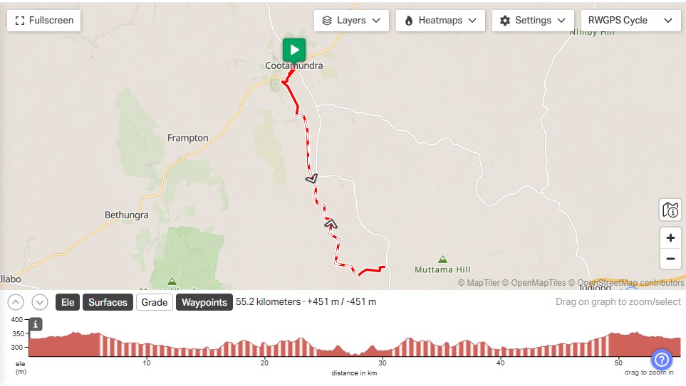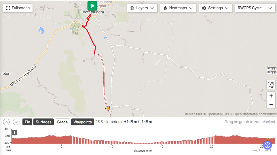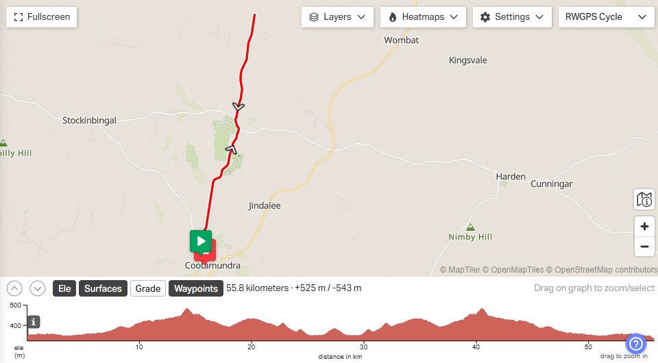 A 26 km out-and-back for the gravel enthusiasts. A quiet rural back road with well-formed gravel, travelling along the foot of the range heading South-East out from Cootamundra.